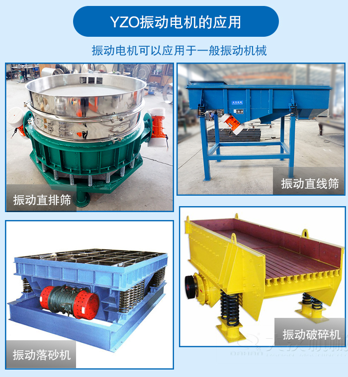 振動電機可以應用于一般振動機械,如:振動破碎機、振動篩分機、振動打包機、振動落砂機、振動造型機、振動打樁機、振動提升機、振動充填機、料倉的振動破拱防閉塞裝置等等。