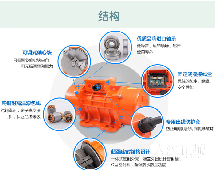 本產(chǎn)品具有技術(shù)含量高,體積小、質(zhì)量輕、噪音低、激振力并可調(diào)節(jié),使用維修方便,耐振力強(qiáng),使用壽命長,啟動(dòng)迅速,停車平穩(wěn),全封閉結(jié)構(gòu)等特點(diǎn),并適用各種制動(dòng)方式,如能耗制動(dòng),反接制動(dòng)等。