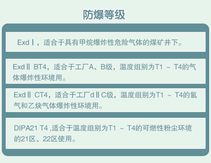 防爆標(biāo)志為ExdⅡ BT4,適合于工廠A、B級(jí),溫度組別為T1 ~ T4的氣體爆炸性環(huán)境用。