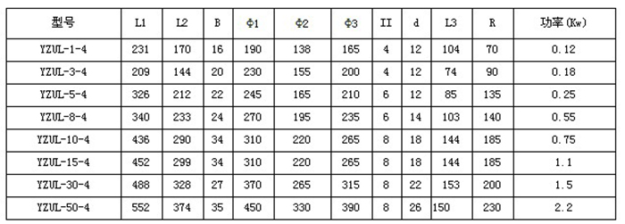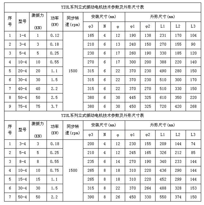 YZUL振動電機技術參數